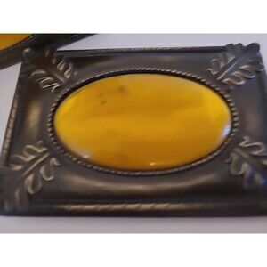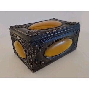 This vintage Art Deco 2 piece trinket box is a stunning addition to any collection. The rectangular shape with a bronze finish and yellow bakelite type oval insets make it a unique and eye-catching piece.