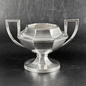 Elegant Art Deco era silverplate sugar bowl or small trophy by Barbour Silver Company, a division of International Silver Co. circa 1920s–30s. Features bold stepped lines, fluted panels, and squared Deco handles with a footed pedestal base. Monogrammed “GSL” in graceful script on one side.