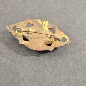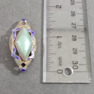 Vintage Art Deco Brooch Green Celluloid Stone Blue Enamel Embossed 1.5"