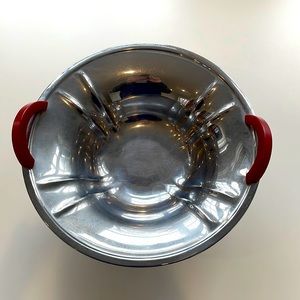 A vintage red bakelite handle and chrome art deco style round serving bowl. This 10”round bowl features a 2" pedestal and two half-round red bakelite handles. Truly a wonderful vintage piece. Scratches are present throughout the piece, in keeping with its vintage age and wear. There are a few small corrosion spots throughout. Please see photos as they are part of the description.