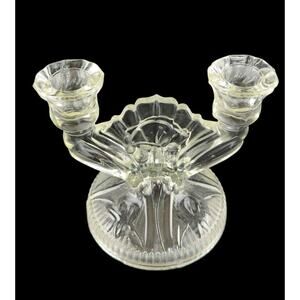 Add a touch of timeless elegance to your home with this stunning pair of vintage Art Deco glass candelabras! Featuring a classic shell fan design and a sturdy, decorative base, these double-arm candle holders are perfect for creating a romantic ambiance for dinner parties or adding a sophisticated sparkle to your mantel or tablescape. Their clear, pressed glass construction beautifully catches the light, making them a dazzling centerpiece in any room. In wonderful vintage condition, any gentle wear only adds to their authentic historic charm. Grab this gorgeous set and let your decor shine!