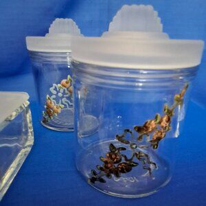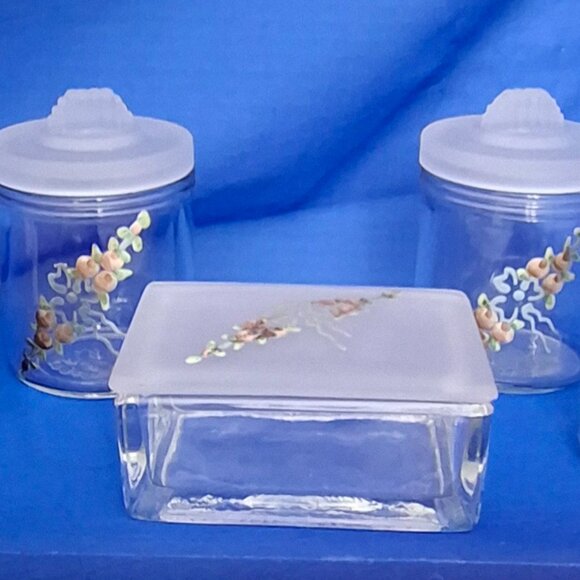 Vintage Art Deco Kruger Glass 5 Piece Nursery Vanity Set features frosted glass lids with Art Deco style. This set includes 4 round jars, 2 5/8" wide x 4" tall and a covered box 4" long x 2 5/8" wide x 2 1/8" tall. Each piece is decorated with glossy enamel painted flowers with blue bows. A great size for trinkets, jewelry or vanity storage. No chips, cracks, or repairs. Please view the pictures and feel free to ask questions. Thank you for visiting my shop.