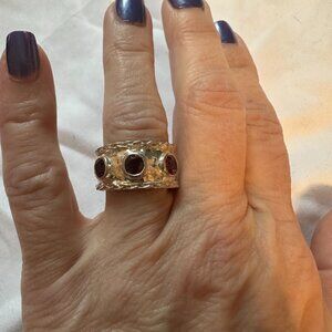 ⭐️Amazing Art Deco Estate Find! Vintage Wide Solid Gold Renaissance Style Statement Ring! Solid with bezel set square cut Amethyst and Citrine, red ruby, yellow citrine, peridot, garnet gemstones. The ring is pretty wide and very ornate! The design is just beautiful! Please see all pictures before purchasing. Solid stamped and tested 10K Gold! See the pictures for size reference. It’s about 15mm wide on top and tapered down to about 5mm on bottom of shank. Size is about 6.75 on mandrel. Beautiful unique textured band ring! Hammered dotted braided texture/high shine finish. Will be cleaned and hand polished before shipping!