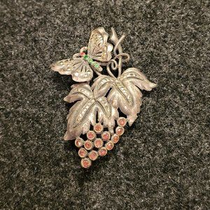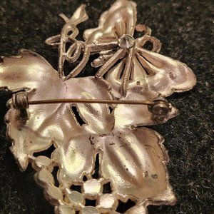 This vintage Art Deco pot metal brooch has red and green rhinestones. This pot metal resembles pewter. There is a butterfly and leaf design and the butterfly turns slightly which is a unique design. The brooch measurers 3" by 2." There is a roll over pin and clasp. You can see there is a thin coat of silver plating on the back of the brooch. See pictures for more details.