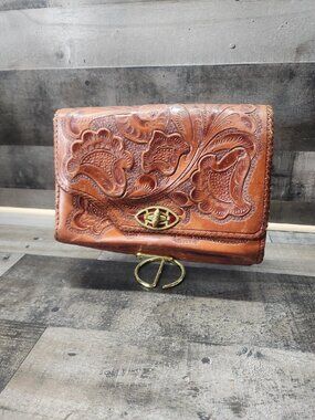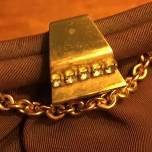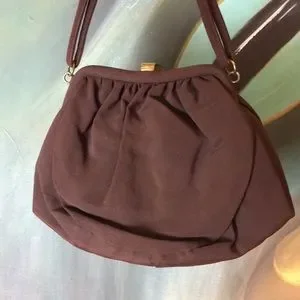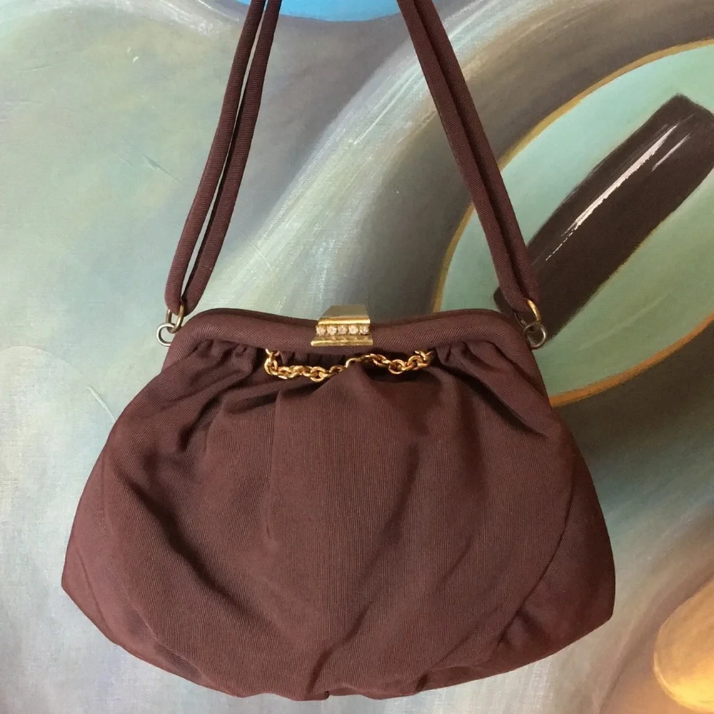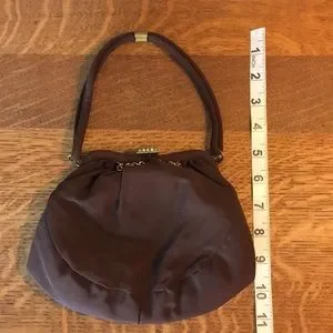 Brown fabric wrist purse with deco clasp and salmon pink satin lining. This bag doesn’t look used-great condition-snap shows slight signs of age (see last photo).