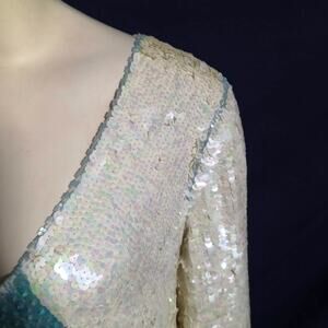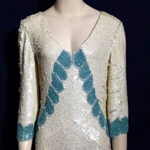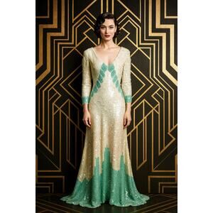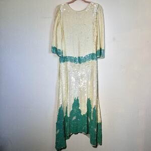 Vintage Art Deco Gown, Long, Silk, Style Circa 1920's - 1930's. Stunning high-low dress (sides are longer than the front and back, 11" slits at side hemline ), v-neckline, 3/4 length sleeves, full coverage in creamy iridescent sequins, celadon green sequins and beads that sparkle and shift color in the light. The gown has a stunning liquid drape and the type of silk has a slight stretch offering comfort as well as beauty. Handwritten Tags (see photos) Estimating Size: Medium. Measurements: pit to pit 18" (36" chest circumference), waist 14", (28" waist circumference), hips 16" (32" hips circumference). Very Good Condition. See photos for a couple of missing sequins on back, a couple of loose threads and the side seam requiring 2" mend. Smoke Free Home. *could not resist the AI created Old Hollywood Glamour picture, dreamy era for sure!