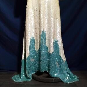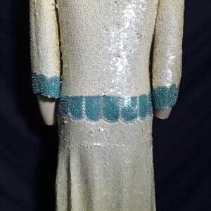 Vintage Art Deco Sequin Beaded Gown Cream Green M Ballroom Pageant Competition