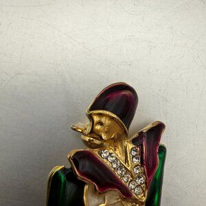 Elegant vintage figural brooch featuring a stylized Art Deco–inspired lady design. This striking piece showcases rich burgundy and emerald green enamel with black accents, a sculpted gold tone figure, and clear rhinestone detailing along the bodice and neckline. The elongated silhouette and dramatic color palette give this brooch a bold, theatrical presence. A standout vintage accessory perfect for collectors of figural, Art Deco, or statement jewelry.