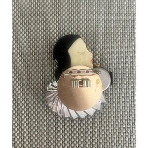 A striking vintage-inspired brooch featuring a detailed woman's profile with rhinestones and acrylic accents, ideal for accessorizing formal or casual attire. Watch attached is meant for decorative purposes only, does not keep time.