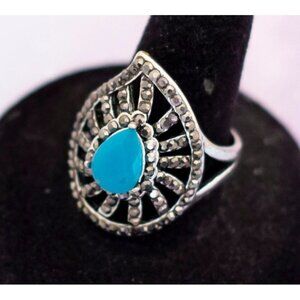 A vintage silver tone ring that has a blue gemstone in the shape of a water drop.