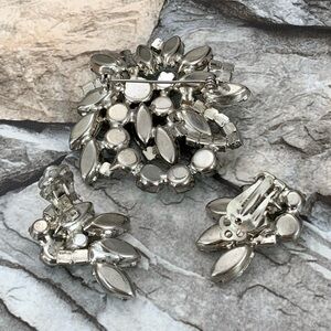 Fabulous vintage dimensional aurora borealis shades of blue art glass prong set chaton & marquis rhinestones silver plated figural flower brooch & ear climber clip earrings. Brooch measures approximately 2 1/4” long by 2 1/2” wide & earrings are 1 1/2” long. Unsigned beauty! This is a VINTAGE item so please expect wear as shown. No chips or cracks, but some minor wear to stones. What you see is what you will receive. 100% authentic.