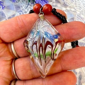 A gorgeous 2” diamond of Dichroic Art Glass is the center point of this vintage choker Necklace from the 80’s/90’s. Silver metallic, rusty red, blue & green are glowing from the pendant. This is combined with lustrous black glass seed beads and rich Red Jasper genuine stone beads in squares & rounds.