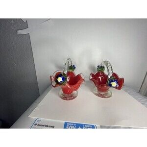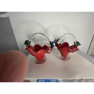 Vintage Art Glass Red Clear Basket Applied Blue Flowers Beautiful 2 Baskets