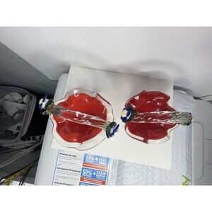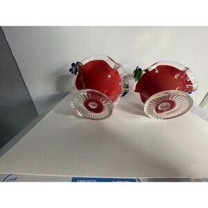 Vintage Art Glass Red Clear Basket Applied Blue Flowers Beautiful Comes with TWO baskets4.5"Tall 5" WideRed Glass-ArtFabulous Glass Basket, clear handle, blue floral accent flowersI do not know the ArtistCould be used for many things decorations, trinket jewelry holder, put mini flowers etc.