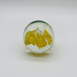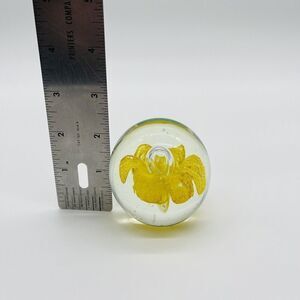 Vintage Art Glass Round Paperweight Yellow Flower Controlled Bubble