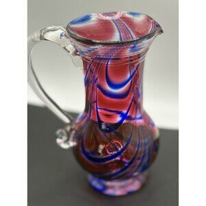 Vintage Art Glass Vase Cobalt Pink Swirl 6.5" Hand Blown Pitcher