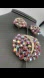 Brooch and earrings are adorned with hues of pink and purple Aurora Borealis rhinestones in an openwork, textured goldwash setting.