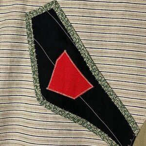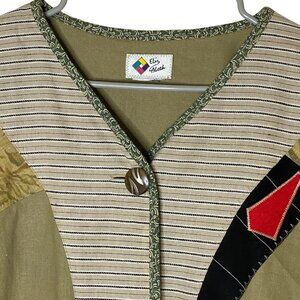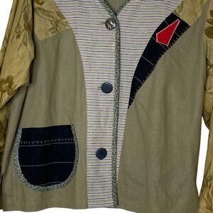 One-of-a-kind Eliz Abeth “art to wear” statement jacket no size tag but fits XL. Features a mix of floral, striped, and colorblock patchwork panels in earthy tones with bold red and black accents. Button front with unique mismatched buttons, decorative trim, and a relaxed fit that gives handmade, folk-art vibes. Perfect for layering or standing out in a sea of basics.