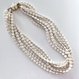 Old plastic celluloid circular white beads seven strand necklace with gold decorative clasp. Clasp is still bright and shiny and works properly. One of the beads on clasp has a chip. Overall excellent condition for its age. Measures 23” in length.
