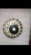 Goldtone circle with two layers of round white rhinestones, topped off with a black lacquer- looking (probably a glossy Black Onyx) flat top and a prong set rhinestone in the center.