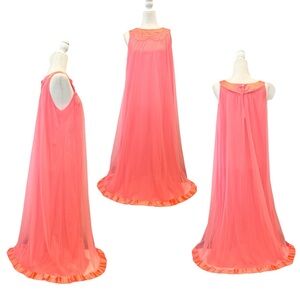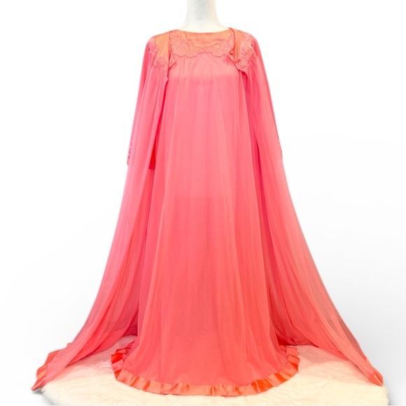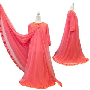Vintage Artemis Gossard Pink Coral Silky Satin Sheer Chiffon Maxi Gown Robe Set