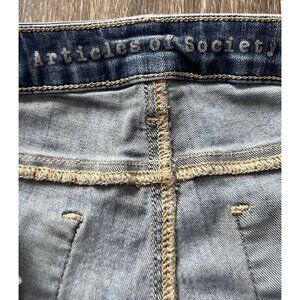 The product is a pair of Vintage Articles of Society jeans for women in size 27. They feature a dark wash skinny ankle style in a stony hill color. Made from a cotton blend denim fabric, these mid-rise jeans have a zip closure and are part of the city theme collection. The brand is Articles of Society, known for its quality and unique designs. With a 25.5-inch inseam, these skinny jeans are perfect for a stylish and edgy look.