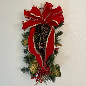 Vintage Artificial Pine Christmas Teardrop Swag with Pine Cones And Ribbon Bow. Gold glitter accents. Has back hook for hanging. Measurement = 22” L x 12” W. Used, but in great condition. I think I bought it from Costco a long time ago so it is well made.