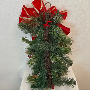 Vintage Artificial Pine Christmas Teardrop Swag with Pine Cones And Ribbon Bow.