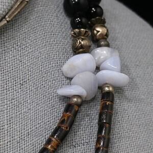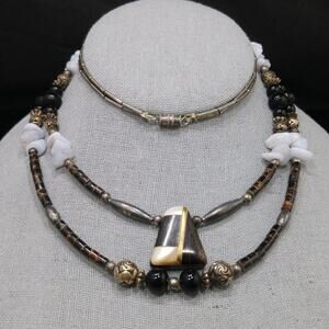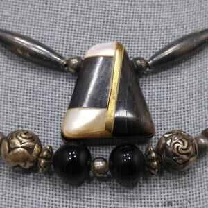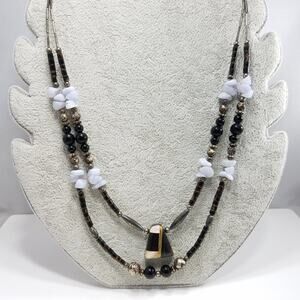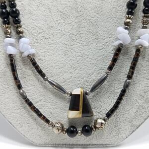 *Description: This is a unique and natural beaded necklace with shell inlay on the pendant and gemstones which measured as Quartz on the Presidium gem tester. The round black beads appear to be beaded onyx. There are silver plated rose beads and silver tone bugle beads. There are also a variety of seed, wood, and natural materials beads. Each bead is strung on wire and there are two long strands. The clasp is a silver tone barrel screw clasp. This is an artisan necklace and appears to have been made in the 1970s. This would be a great addition to your vintage jewelry collection or make a great vintage gift!