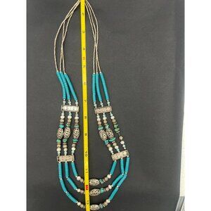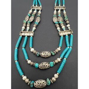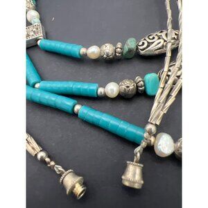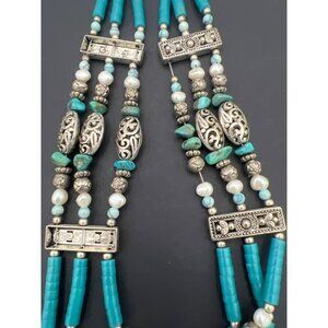 Vintage Artisan Southwest Necklace Blue Beads Pearls Silver Tone Filigree Boho