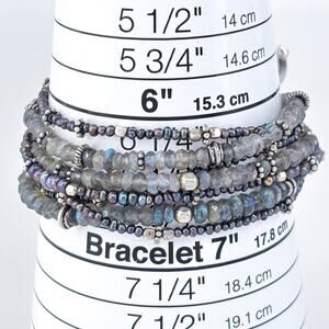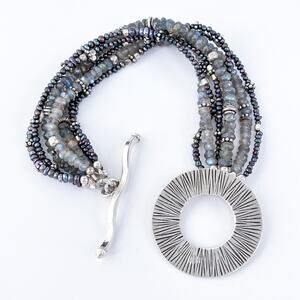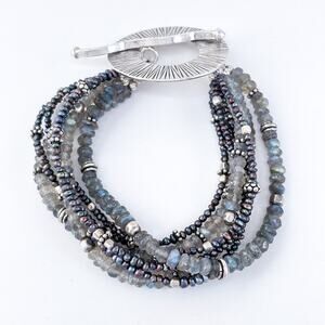 This striking artisan bracelet features iridescent labradorite and deep-hued pearls woven into multiple strands with sterling silver beads. A bold etched toggle clasp adds a sculptural touch, making this piece both secure and eye-catching. Perfect for elevating casual ensembles or adding flair to evening wear.