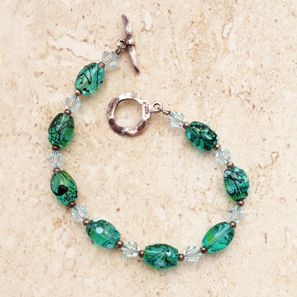 Vintage Boho/Artisan bracelet. Lovely pale blue AB crystals and teal cut art glass beads with Sterling toggle clasp. About 7.5" long. Marked 925 with some age appropriate patina. Lovely example of a classic style. In excellent condition.