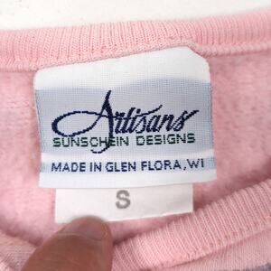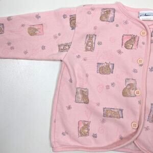 Vintage Artisans Sunschein Designs adorable light pink button down cardigan sweater with a very sweet bunny print. Size is tagged as small, which looks to fit like 4T. Please check the measurements.