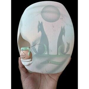 This vintage handcrafted pottery vase features a beautiful Native American Southwest design with a wolf motif. The vase is signed by the artist and is an original piece of art pottery. The vase is multi-colored and made from ceramic, with no additional parts required for use.
