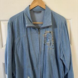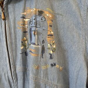 Vintage Artistic Jean Jacket L Blue City Retro Bohemian Fall Teacher Beaded 90s