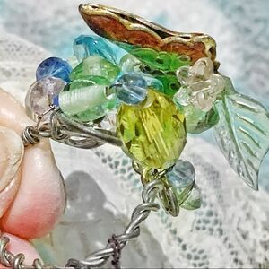 Unique and unusual artist handmade ring . The ring is made of twisted wire with a beautiful vintage Cloisonné enamel butterfly, crystal beads and glass leaf. Soft pastel colors frame the butterfly. The ring is large, approximately a size 11, Lovely , never used. Please see all photos for full description.