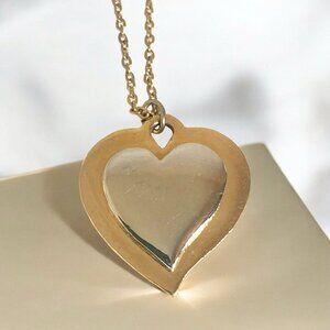 FEATURES: Silver-tone and gold-tone layered heart pendant on a 16" chain with a spring ring clasp. See photos for more details.