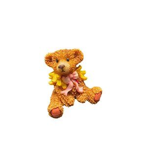 This delightful vintage Artmart teddy bear figurine exudes charm, showcasing intricate craftsmanship. Adorned with a soft pink bow and yellow flower accents, this petite bear evokes nostalgia and whimsy, suitable for collectors or as a sentimental gift. Its textured finish adds a lifelike touch, embodying both artistry and timeless appeal.