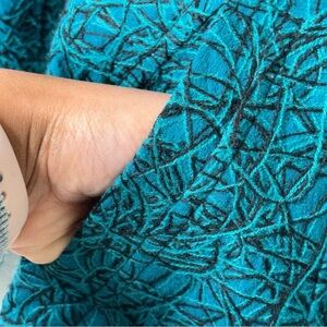 A fun abstract print in the color teal green and black colorway. 2 front side pockets. large button. Fully lined.