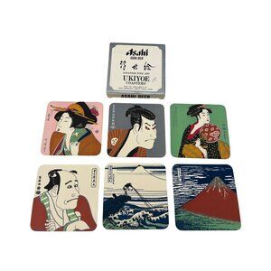 Vintage Asahi Beer coaster set featuring traditional Japanese Ukiyo-e artwork. This complete set of 6 cardboard coasters includes reproductions of works by renowned artists like Hokusai, Utamaro, Kuniyoshi, and Toyokuni. Each coaster is backed with Asahi Beer branding and comes housed in the original printed box. This set was originally issued as a promotional item by Asahi Breweries Ltd., Tokyo, Japan. A fun and functional crossover of fine art and mid-century beer advertising. Each coaster measures 3.75" and was printed in Japan. Great for fans of vintage advertising, Japanese art, or breweriana.