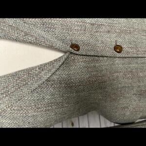 Light tweed; notch collar; long sleeves w/three wooden button details; single-breasted; 3-button front placket; chest pocket; two front flap pockets; inside pocket; 10" back pleat; lined; curved hem; ACTWU made; no size tag please see measurements