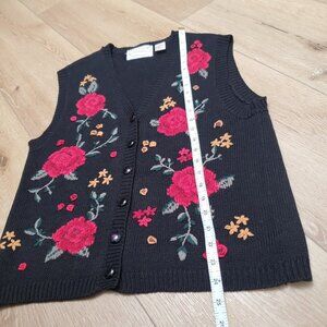 Vintage Ashley Hand Embroidered Floral Cardigan Sweater Vest Womens Size L Black