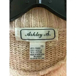 This vintage Ashley S knit sweater is a perfect addition to your casual wardrobe. The pink and white heathered design, along with the pearl button mock neck, makes it a stylish and unique piece. The sweater is made of Ramie material and is an original 1980s piece, perfect for those who love the Art Deco look.