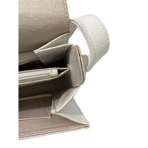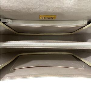 Good used vintage condition. Some scuffs on the bottom, left side and the front/top. There is a faint outline of where the gold snake lands when flipped up. There is some cracking on the inside of the flap and some discoloration on the inside of the middle zipper pocket. See photos of all.