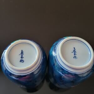 Vintage Asian Art Cups with Lids Flowers Leaves Edged in Gold Tone Hand Painted