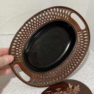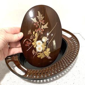 Vintage Asian Faux Wood Lacquer Lattice covered candy dish mid century floral