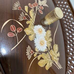 Vintage Asian motif faux wood lacquer look bowl - wide lattice rim covered candy dish - plastic with stamped hallmarks - a mod mid century decorative floral design. Goldtone top knob and glittery highlights - lovely mahogany brown color. In excellent vintage condition - light surface wear - no damage or flaws.