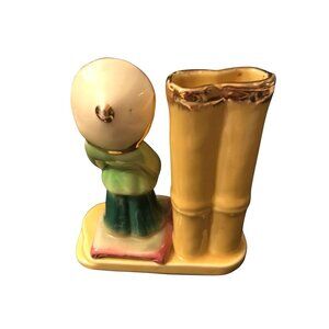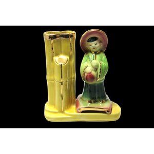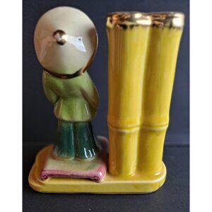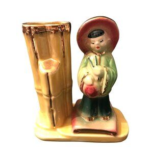 A charming vintage Asian figurine paired with a bamboo-style vase, perfect for adding an artistic touch to your decor. This collectible piece from Shawnee Pottery enhances any setting with its unique design and cultural flair. MCM with shiny glaze and gold-toned accents.