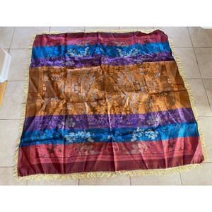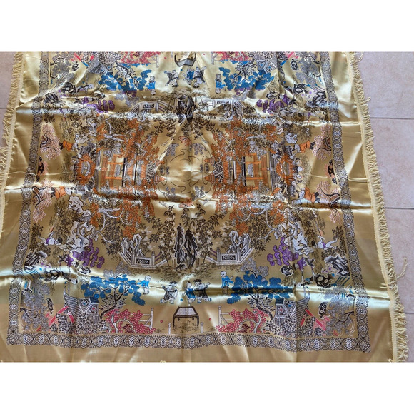 Vintage Asian Tapestry Brocade Piano Shawl Gold Chinese 48" Tablecloth Excellent