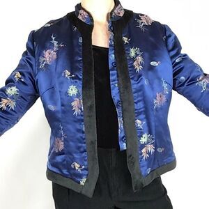 Vintage Asian Mandarin collar women’s jacket blue cropped M L satin floral print black fleece trim